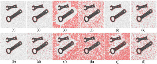 Segmentation results after adding noise. (a) The result of adding noise with variance of 0.01 to our model; (b) the result of adding noise with variance of 0.02 to our model; (c) the results of adding noise with variance of 0.01 to LIC model; (d) the results of adding noise with variance of 0.02 to LIC model; (e) the results of adding noise with variance of 0.01 to LBF model; (f) the results of adding noise with variance of 0.02 to LBF model; (g) the results of adding noise with variance of 0.01 to 0.5-order; (h) the results of adding noise with variance of 0.02 to 0.5-order; (i) the results of adding noise with variance of 0.01 to 1.5-order; (j) the results of adding noise with variance of 0.02 to 1.5-order; (k) the results of adding noise with variance of 0.01 to CV model; and (l) the results of adding noise with variance of 0.02 to CV model.