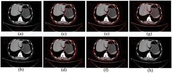 At the same time, we used abdominal CT images taken by one of the authors of this paper during a hospital physical examination this year to compare the actual effectiveness of these segmentation models, as shown in Figure 8. It can be clearly seen from (g) in Figure 8 that the CV model cannot recognize the edge of the image because the initial contour we set is far from the image. As can be seen from (c–f) in Figure 8, unnecessary contours appear in the segmentation results of other models. However, our model still maintains a good segmentation effect, which reflects the advantages of our model.