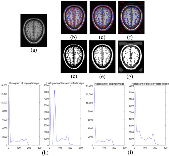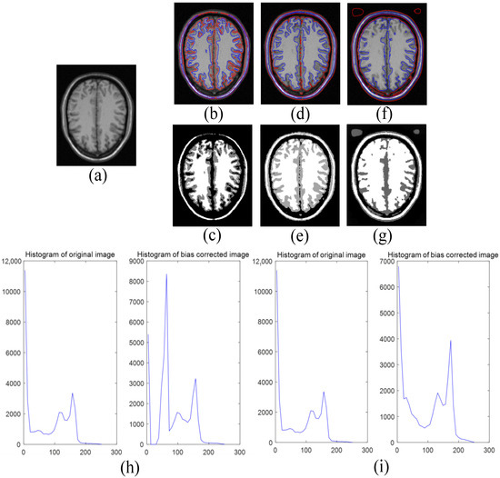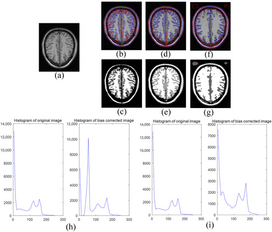 Finally, compared with the LIC model and the ALFB model, we tested the multiphase level set function of the brain image (see Figure 9, Figure 10 and Figure 11). We can see from Figure 9f,g, Figure 10f,g and Figure 11f,g that the segmentation effect of the ALFB model is far inferior to our model and the LIC model. Compared with the LIC model, our model is very sensitive to the change of the image gray value. We can see that the red area in the figure is obviously more than that of the LIC model, and the blue area also includes the areas not recognized by the LIC model in some details. In addition, in the LIC paper, it is introduced that whether the image quality is improved through comparing the original image and the histogram of the bias correction image [24]. Due to the mixing of the intensity distribution caused by the deviation, the original image cannot have well-separated peaks. However, the histogram of our model (see Figure 9h, Figure 10h and Figure 11h) shows three well-separated peaks on the histogram of the image after deviation-correction, which correspond to the target or background of the image.