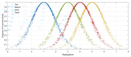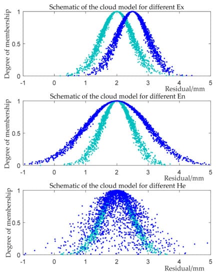 The parameter expresses the central value of the qualitative concept in the universe space, represents the value of the qualitative concept at 100% membership and is the center of gravity of the cloud drop group corresponding to the qualitative concept. The parameter represents the fuzzy degree of the corresponding numerical range of the problem described by cloud model, which is defined as standard deviation. The range of values that can be accepted by qualitative concepts in the universe space is expressed. Parameter reflects the randomness of the occurrence of samples representing qualitative concept values, which is defined as the standard deviation of entropy. It is the uncertainty measure of entropy, which reveals the relationship between fuzziness and randomness. The cloud model schematic diagram of different are shown in Figure 2.