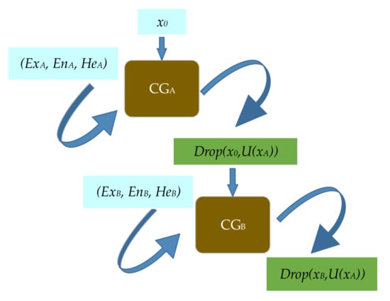 In this paper, we use single-rule reasoning (if A then B) to combine X-conditional cloud generator and Y-conditional cloud generator to form a single-rule cloud generator (see Figure 5). is the X-conditional cloud generator and is the Y-conditional cloud generator. When is specified, generates a random membership that satisfies the cloud model, and this membership can output a random cloud drop that satisfies the cloud model of the posterior part of the rule through .