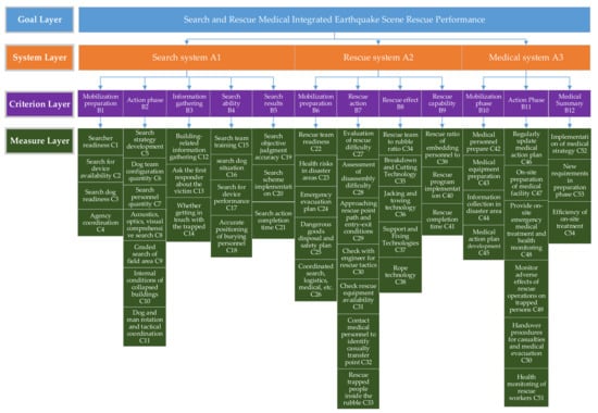 According to the rescue performance assessment indexes given in the INSARAG guidelines [9], an index system—including search and rescue medical integrated earthquake scene rescue performance as the goal layer, the search system, rescue system and medical system as the system layer, 12 indexes, such as mobilization preparation B1 and action phase B2 as the criterion layer, and 54 indexes as the measure layer—was established. All indexes and their subordinate relationships are shown in Figure 7.