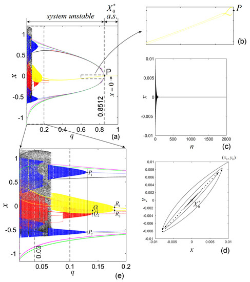 DLM of FO. (a) Bifurcation diagram vs. q. The bifurcation-like point P indicates the beginning of the stability of for ; (b) zoomed image; (c) time series tending to the asymptotically stable fixed point for ; (d) phase portrait with the orbit points indicating the evolution of the orbit to ; (e) zoomed area of the bifurcation diagram.