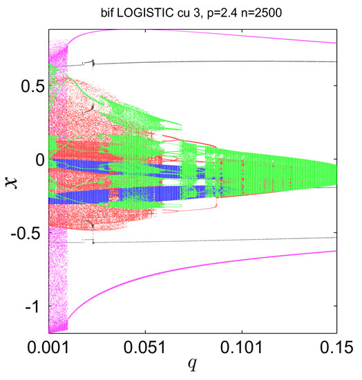 To obtain a visual summary of the dynamics of the DLMFO one considers the Bifurcation Diagram (BD) with respect to the fractional order . As one can see in this section this useful tool should be considered for FO discrete systems with precaution not only due to the mentioned nonexistence of periodic solutions in continuous and also discrete FO systems, but also due to a non-invariance-like with respect to initial conditions (see also [41]). Thus, it is shown empirically that to every considered initial condition corresponds a different diagram which, for avoid the confusion with the BD, will be called the Bifurcative Set (BS). So, while for IO discrete systems, such as the logistic map, the BD has a unique shape for whatever initial conditions, in the sense that the diagram obtained for parameter variation has the same shape for whatever initial conditions (see also [42]), the DLMFO has the BD as “composed” of several different BSs, one for each considered initial condition. This characteristic are more evident q values close to 0.