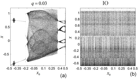 The following experiment reveals the fact that for any of 600 considered initial conditions within the segment , for , and , in the bifurcation diagram vs. initial condition, and with constant, there correspond different attractors (Figure 5a). Because there are an infinity of points within the considered segment, one can extrapolate the idea that to every initial condition there exist different BSs. On the other side, from Figure 5b one can see that for the IO case of the considered system, the initial conditions give birth to similar (chaotic) attractors. This is in agreement with the cases of IO other discrete and continuous systems where BDs do not present such sensible dependence on initial conditions.