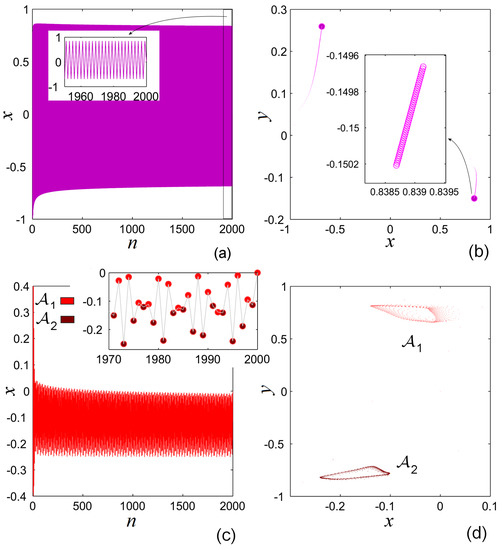 Figure 3b reveals the consistency of the analytical result of the asymptotical stability of with the numerical results (point P with ). Moreover, the zoom in Figure 3b shows a periodic-like orbit, which exists for . Figure 3c,d present the time series and phase plot, respectively, indicating the behavior of an orbit starting close from , which tends asymptotically to for .