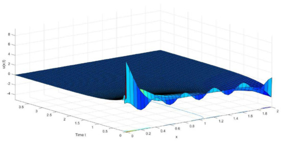 with and . Let , for which is the only eigenvalue of the matrix . The solution of the Lyapunov Equation (41) is the matrix , its maximal eigenvalue is and the value of the constant a in the inequality (41) is equal to 1. Let and . It is easy to verify that the nonlinear function satisfies the A hypothesis with . Therefore, all assumptions of Theorem 1 are satisfied. The kernels , and the state feedback given, respectively, by (18), (19) and (24) can be computed explicitly. Using (59), it follows that . We note that the explicit computation of the optimal value of L is hard to determine. For the numerical simulation, we adopt the finite difference scheme directly to discretize System (67)–(71). The steps of space and time are taken as and , respectively. In addition, we take and the initial values of system states are . As a result, the simulation of the solution is plotted in Figure 2 and Figure 3. Figure 2 displays the state , while Figure 3 shows the trajectory of the state . It can be seen that both the states and converge to zero, which indicates that the closed-loop system, System (67)–(71), is exponentially stable.