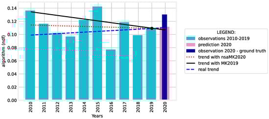 For Figure 1, the best auto-ARIMA prediction for 2020 was obtained when p = 1, d = 0, and q = 1, with an AIC score of −38.633. We may observe that the trend changes from “decreasing” when considering 2010–2019 to “increasing” (ground-truth) and our method nsaMK offers a more appropriate result than MK2019. In the case depicted in Figure 2 the auto-ARIMA obtained the best results when p = 1, d = 0, and q = 0, where the AIC score was −35.658. We may observe that the trend provided with our nsaMK method offers a more suitable result than MK2019.