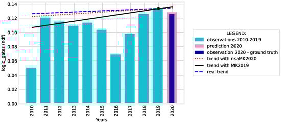 In Figure 1 and Figure 2, we present two representative examples, namely for the ’algorithm’ and ’logic gates’ key terms. The light blue observations (i.e., for 2010–2019) are used to compute the slope marked with black solid line by MK2019, the last nine light blue observations, together with the pink-marked auto-ARIMA prediction are used by nsaMK2020 to evaluate the slope presented with red dotted line, and the last nine light blue observations together with the dark blue observation for 2020 are used by MK2020 to reveal the real trend depicted with a blue dashed line (ground truth).