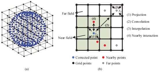 Firstly, a uniform 3D grid should be constructed as shown in Figure 1a, and the problem domain is divided into an array of 3D small cubes that are equal-sized. The process of division can be adaptive until the number of boundary collocation points in each cube is less than a threshold value (typically 20). As shown in Figure 1b, the interaction computation is separated into two parts: near-field and far-field. With the help of the 3D grid, the far-field part (collocation points in nonadjacent cubes) is computed quickly, and the near-field part (collocation points in adjacent cubes) is calculated directly. Thus, the pFFT algorithm consists of four steps: projection, convolution, interpolation and nearby interaction.