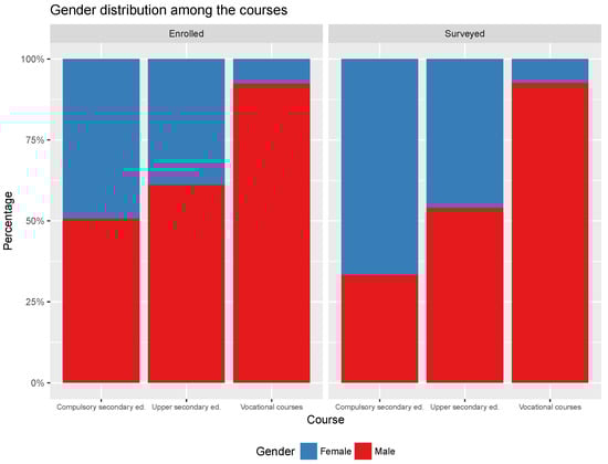 Distribution of gender among the students enrolled (on the left) and surveyed (on the right), per course (Compulsory secondary education, Upper secondary education and Vocational courses).