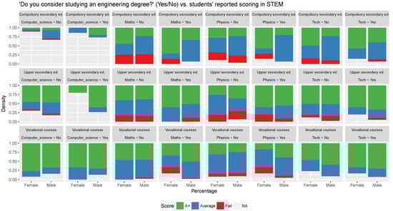 Comparison between what the students reported about their scores in STEM subjects and their plans for studying (or not) engineering. The question was “Do you consider studying an engineering degree?”. Results are detailed per course as well as by gender. Since not all students have enrolled in the computer science course, and others have decided not to report their scoring, we represent these as blanks (NA) because they give valuable information too.