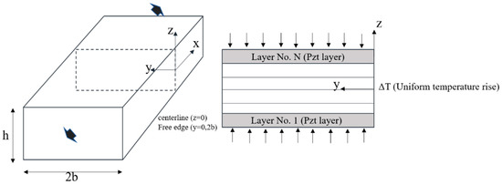 A schematic of the piezo-bonded smart composite laminate is shown in Figure 1. It is composed of piezoelectric (PZT) actuators attached on the upper and lower surfaces of the laminates. The laminate width is represented by ‘2b’, which is four times the thickness of ‘h’. First, the tensile load is applied on the laminate’s free edges (0, 2b) along the x-direction, generating significant interlaminar stresses. These stresses are reduced by using the combined electric and thermal fields. The constitutive equations [37,38] used for the modeling of the smart composite laminated structure are discussed in this section.