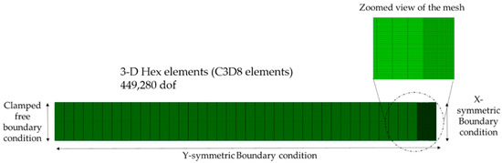 Although the stress-function-based approach for interlaminar stress analysis is effective, an FE-based solution is computed in ABAQUS to validate the present analysis results. The thickness of each lamina is 0.0125 cm and PZT layer is four times the thickness of the composite lamina. Four laminae with the same fiber orientation are assumed as one lamina to match the thickness of the PZT layer. The obtained interlaminar stresses are compared with the 3D finite element solutions computed from the ABAQUS software [41]. Three-dimensional ‘HEX’ (C3D8) is chosen in ABAQUS, with a total of 449,280 DOF. The length of the solid laminate follows the plane strain condition, i.e., the length is ten times larger than the width of the laminate (L = 10 × 2b = 40H). Axis-symmetric boundary conditions are employed, and the quarter model is used to reduce the computational cost, as shown in Figure 2. The results are extracted at the middle part of the laminate, where the boundary layer effects along the x-axis decayed. To reduce the computational time, the element size is refined at the middle region where the results are extracted, while the relatively coarse mesh was applied in the other region. Global and local coordinates were defined to describe the laminate and material behavior correctly.