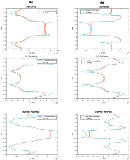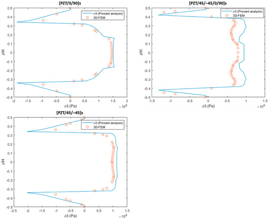 This section consists of piezo-bonded composite laminates under combined 0.1% uniaxial tension and unit temperature rise thermal loading (ΔT = 1). Three layup configurations are analyzed. A clamped boundary condition is adopted at one end along the x-axis, while at the other, a 0.1% longitudinal tensile strain load is applied. Unit temperature rise is employed throughout the composite laminates. Figure 3a,b show the free-edge interlaminar stress (σ3) distribution under tensile and thermal loadings. Stress concentrations occurred at the interfaces of the layers. The result of the present method correlates well with the 3D finite element result, but the FE-based solution underestimates the stress concentrations at the free edge. All the graphs show that the present method’s solutions are greater than the 3D finite element solution, because the 3D solid elements popularly used in FE analysis are based on the displacement field; the solution cannot guarantee the statically admissible stress field, even though the displacement field is exact.