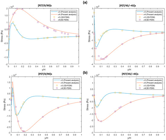 Figure 4a,b signify the normal (σ3) and shear stresses (σ4) at the PZT/0 and PZT/45 interfaces of the laminates under 0.1% uniaxial extension and unit thermal loading (ΔT = 1). The maximum normal stress (σ3) concentration in both cross-ply and angle-ply laminates occurs at the free edge that can cause the PZT layer’s delamination failure. The present analysis results of free-edge of cross-ply and angle-ply indicate that the large shear stress (σ4) represents the satisfaction of the traction-free boundary condition and becomes null at the interior region. The results of the 3D-FEM solution show good agreement with the present analysis results.