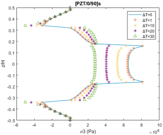 Thermal loading has the capability to reduce the interlaminar stresses generated by the extension load. The stresses or strains caused by thermal loading can compensate for the stresses and strains induced by the mechanical loading, due to the thermal-mechanical coupling phenomenon. This, in turn, reduces the peeling stresses and enhances the lifespan of the composite structures. Figure 5 shows an example of free-edge interlaminar stress σ3 of cross-ply laminate under the combined 0.1% uniaxial extension loading, and the variable rise in the thermal loading throughout the laminate. The interlaminar stress distribution’s magnitude is reduced at the PZT/0 layer and 0/90 layer interface by increasing the laminate’s temperature. Without the thermal loading, the magnitude of peeling stress is 8.3 MPa; however, as the temperature loading of ΔT = 30 is applied, peeling stress is reduced to 2.9 MPa.