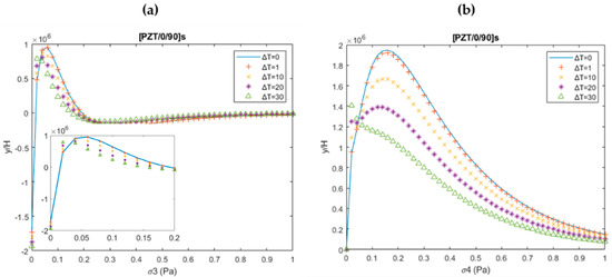 Similarly, Figure 6a,b show the (σ3) and (σ4) distribution through the in-plane direction at the PZT/0 interface. The magnitude of the peeling stresses decreased significantly with the increase in thermal loading: