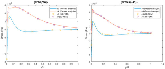 σ3 and σ4 at the PZT/0 and PZT/45 interface of cross-ply and angle-ply laminates under the electrical excitation.