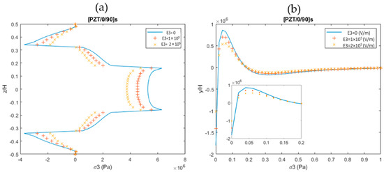 This section provides the stress distributions at the free edge and the interfaces of the laminas under the combined thermo-electro-mechanical loading. The induced stresses and strains generated by mechanical loading can be reduced by the applied thermal and electric excitation loading due to the combined coupling effect. Thus, the extent of free-edge interlaminar stresses can be lower down, which results in expanding the service life of the smart composite structures. Figure 9a shows the interlaminar stress σ3 of the free edge of the cross-ply laminate under the combined thermo-electro-mechanical loading with 0.1% uniaxial tension, temperature loading of ΔT = 10, and the variable electric field of (E3 = 0 V/m, E3 = 1 × 105 V/m, and E3 = 2 × 105 V/m). It can be observed that, without applying the electric field, the concentration of peeling stress is 6.3 MPa, and upon applying the excitation of 2 × 105 V/m, it is reduced to 4.7 MPa (up to 25.3% reduction). Similarly, at the PZT/0 layer in the in-plane direction, the peak value of the concentrated peeling stress drops with increased electric field loading.