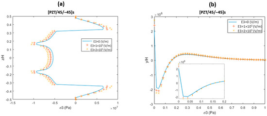 In the case of angle-ply laminate, Figure 10a shows the interlaminar stress σ3 at the free edge under the combined thermo-electro-mechanical loading with 0.1% uniaxial tension, temperature loading of ΔT = 10, and the variable electric field of (E3 = 0 V/m, E3 = 1 × 105 V/m, and E3 = 2 × 105 V/m). Large stress concentrations can be seen to occur on the free edge of the 45/−45 layer interface. When an electric excitation at the piezoelectric layer is applied, the peeling stress in angle-ply laminate could be significantly reduced.