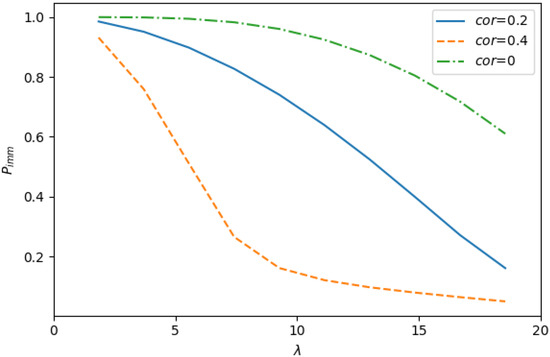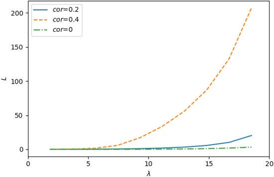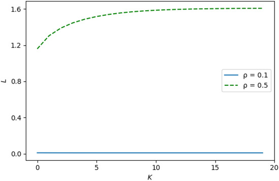 As seen from Figure 6 and Figure 7, under the same value of input rate , the performance indicators under study significantly depend on the correlation in the input flow. With increasing the coefficient of correlation, these indicators become worse: the value of L increases and the value of decreases. From this observation, it can be concluded that when evaluating the performance indicators of the system, it is extremely important to take into account the correlation in the input flow.