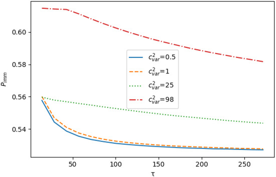 In what follows, we found the value of for different system loads. The load changes by changing the value of input rate , which, in turn, changes by multiplying the matrices and D by the corresponding coefficients.