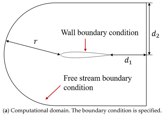 Three C-type grids of the NACA64A010 airfoil with different cell numbers are used for the grid convergence study of the SPF model. The schematic diagram of the computational domain and the boundary conditions are illustrated in Figure 2a. The parameters describe the scales of the computational domain and are equal to 40 times the chord length of the airfoil. The fine grid has 681 and 189 grid points in the circumferential direction and the wall-normal direction, respectively. The medium grid and coarse grid have and grid points, respectively. Figure 2b shows the fine grid used in this paper. The lift coefficients of the NACA64A010 airfoil at , and obtained on these grids are shown in Figure 2c. The lift coefficients are plotted as a function of , where is the number of grid cells. In 2D cases, is proportional to the averaged grid spacing. As shown in Figure 2c, the lift coefficient approached the experimental results [5] as the grid became finer. Consequently, the model exhibited good grid convergent behavior.