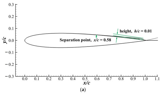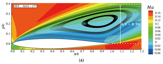Figure 16a,b shows the streamlines past the airfoil at and obtained by the SPF model. At both angles of attack, there was a separation bubble near the trailing edge. As the angle of attack increased from to , the separation point moved forward, and the separation bubble grew, which is exactly the characteristic of trailing-edge stall. This indicates that the SPF model correctly captured the features of boundary layer separation in the trailing-edge stall. Consequently, the SPF model’s applicability was not limited to thin-airfoil stall problems. The model for trailing-edge stall prediction was also satisfactory.