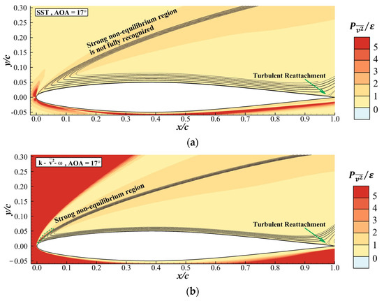 The reason why the SPF model gave a flow with higher momentum between the airfoil surface and the separated shear layer is explained here. In the context of turbulence models based on the Boussinesq hypothesis, a larger can intensify the momentum exchange. Figure 7 shows the contour of given by the SST, and SPF models. The SPF model obtained a larger region where was greater than 2000 compared with the SST and models. Consequently, the momentum exchange was stronger near the separated shear layer in the flow field predicted by the SPF model. Eventually, the stronger momentum exchange will increase the momentum of the flow near the wall. Accordingly, the SPF model gave a shear layer separated from the leading edge, with greater momentum between the separated shear layer and the airfoil surface compared with the SST and models.