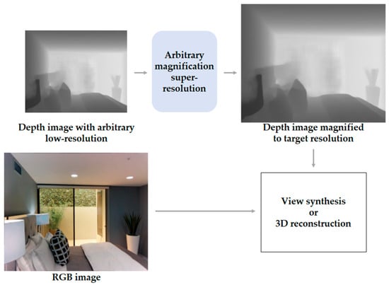 - Truong, A.M.; Philips, W.; Veelaert, P. Depth Completion and Super-Resolution with Arbitrary Scale Factors for Indoor Scenes. Sensors 2021, 21, 4892. [Google Scholar] [CrossRef] [PubMed]
