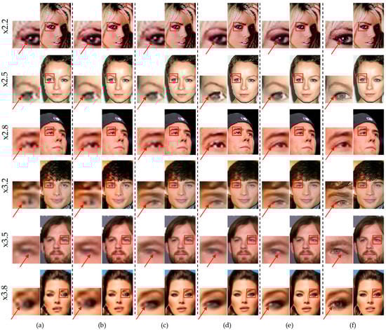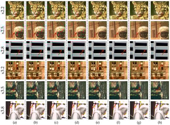 - The proposed model preserves the superiority of the existing integer super-resolution model. By simply adding the hybrid-domain high-frequency model without modifying and additionally training on the existing integer super-resolution model, our model’s arbitrary magnification restoration performance is better than that of state-of-the-art models.