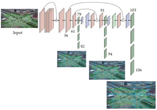 The architecture of the neural network You Only Look Once (YOLO v3) and the open source Simple Online and Realtime Tracking (SORT tracker) were chosen as the technology for the vehicle detection and classification system [77]. The SORT tracker provides the functionality needed to track objects across multiple frames. At the next stage, taking into account the complete or incomplete trajectory of the vehicle, we need to classify its general direction of movement. To do this, you can train a shallow classifier, similar to [78,79]. The heuristic approach was found to work quite well for us during the learning process [80]. For improving the detection and classification accuracy we used multi-scale prediction with an increased number of anchors. To train the neural network, more than 9500 images were marked up and augmented, which allowed the tenfold increase of the dataset.