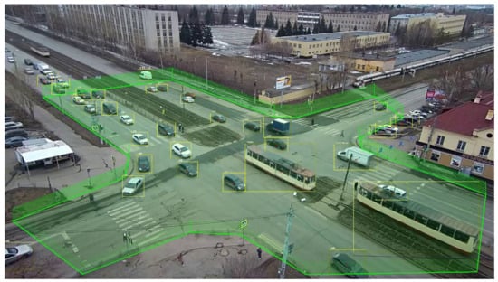 To determine the time of movement of vehicles on a section of the road network, a matrix of perspective transformation of the original image to geographic coordinates was applied. The area in front of the place where the “stop line” marking is applied is divided into several non-overlapping regions. As we track the entire video sequence, we approximate the vehicle position in each frame to the center of the bottom edge of the bounding box. Given the trajectory of each vehicle in image coordinates, it is possible to assign each waypoint to one of the intersection sections. As a result, the trajectory is transformed into a sequence of visited regions, which provides for determining the time and direction of movement of vehicles.