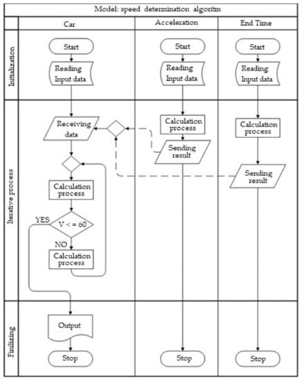 The algorithm of the model operation consists of several sections (shown in Figure 3): car, acceleration, and end time. In the end time section, parameter tend is calculated. The calculation is performed based on the following input parameters: T1, T2, PhaseNumber, PhaseTimer, and CarMeter. The calculation result is passed to the car section.