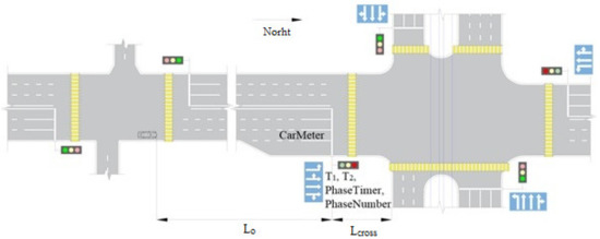 One of the crossroads of the city of Chelyabinsk was chosen for experimental modeling. The intersection diagram is shown in Figure 4. The experiment accepts the conditions that the car starts at a distance L0 to the stop line of the intersection and moves straight in the north direction.