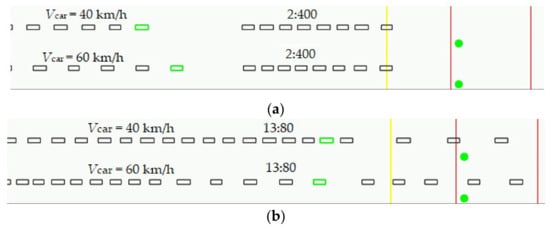 The parameter tend is required for the modeling and depends on the number of cars waiting for the green traffic light signal to permit passage at the intersection. For modeling purposes, statistics were collected for the intersection concerned, as shown in Table 1. In Table 1, the timing starts at the moment when the traffic light becomes active. At the same time, an average of 9 cars manage to drive through one traffic signal cycle in the considered lane. If there are more than nine cars at the intersection, the value T1 + T2 is added to the Tend parameter for modeling—vehicles will cross the intersection only during the next traffic light cycle.