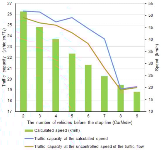 Figure 5 shows the result of the calculations: the dependence of the vehicle speed on the number of cars waiting at the intersection and statistical data from Table 1. Table 2 shows the speeds calculated as a function of the distance L and the number of cars waiting at the intersection. The calculations were carried out in the MATLAB software package.