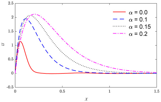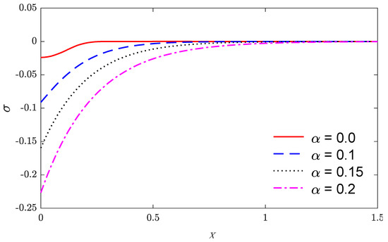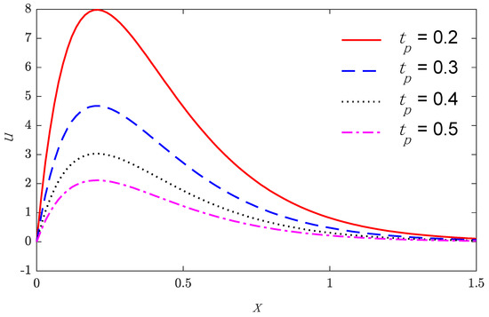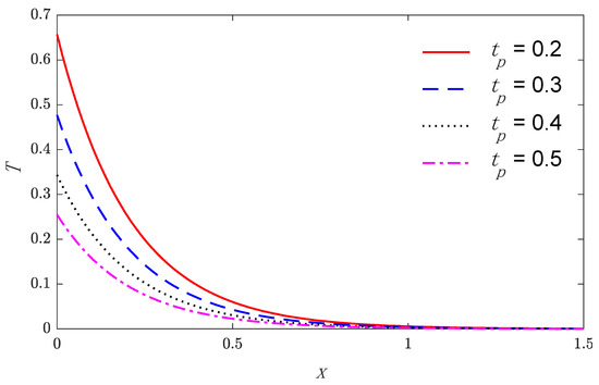 Based on the above parameters, Figure 1, Figure 2, Figure 3, Figure 4, Figure 5 and Figure 6 show that the variations of physical quantities are calculated numerically along the distance x. Numerical calculations are carried out for the temperature, the displacement, and the stress variations along the x-axis under nonlocal thermoelastic model. Figure 1, Figure 2 and Figure 3 show the four curves predicted by different values of the nonlocal parameter considering the time , while Figure 4, Figure 5 and Figure 6 represent the three curves predicted by different values of the characteristic pulse time of heat flux.