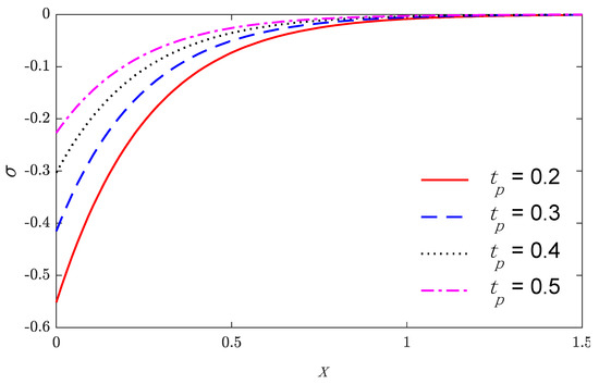 The stress distributions versus the distance for four values of the characteristic time pulse heat flux.