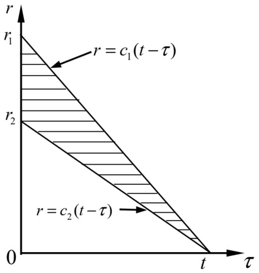 In Equation (4), the coefficients ( and ) contain the wavefront singularity relevant functions (the Heaviside function term the Dirac function term and the derivative term of Dirac function , so, the coefficients ( and ) are wavefront singular coefficients. For the case where the wave has not yet arrived at the field point, the influence value should be mathematically assigned 0. In the process of the integration, the expressions are different in different integration domains, therefore, the entire integration domain needs to be divided. Looking into the composition of the function, the three wavefront singularity relevant functions ( and ) are described by P-wave velocity c1, S-wave velocity c2, the distance r between the source point and the field point, and the time duration of wave propogation. Therefore, division of the integration domain should be dependent with the variables, r, c1, c2 and . By introducing the time-space coordinate system, the division of the integration domain, relevant with the P-wave velocity c1 and S-wave velocity c2, is shown in Figure 1.