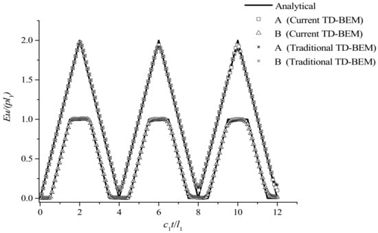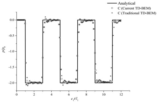 The displacements in direction x in three periods at the center of the loaded end A (l1, l2/2, l3/2) and at the center of the rod B (l1/2, l2/2, l3/2) are calculated from current 3D TD-BEM and traditional 3D TD-BEM (in which singular integrals are analyzed by the indirect numerical method of rigid body displacement [25,30]), and shown in Figure 8, together with the analytical solutions from [45]. The time history of the normal traction at the center of the fixed end of the rod C (0, l2/2, l3/2) from current 3D TD-BEM, traditional 3D TD-BEM and the analytical solutions from [45] are shown in Figure 9. In the figures, the vertical axis is normalized by and respectively, while the horizontal axis is normalized by