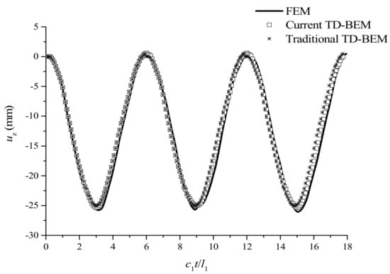Because the analytical solution for the problem of the 2D example does not exist, the results from the current TD-BEM formulation and traditional 3D TD-BEM are compared with the FEM solutions. In the FEM model, a much finer mesh size 0.1 m × 0.1 m × 0.1 m and the much shorter time step 1 × 10−5 s are used. The transient displacements uz in three periods at boundary point D (l1/2, l2/2, 0) in Figure 10 from current 3D TD-BEM, traditional 3D TD-BEM, and FEM formulations are shown in Figure 11.