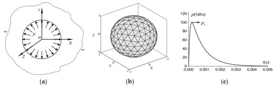 Sketch of the example of spherical cavity: (a) geometry; (b) boundary discretization; (c) explosive load.