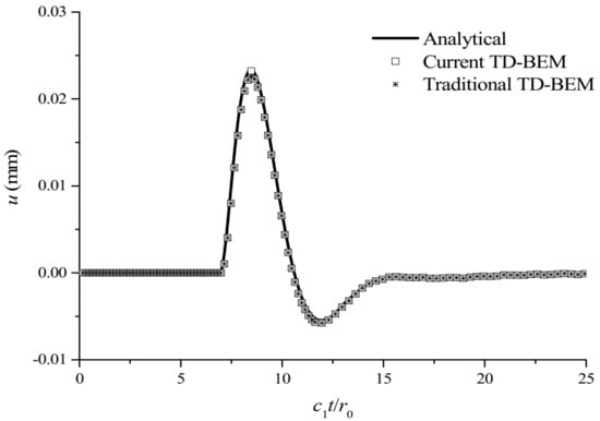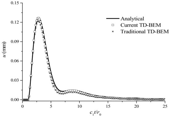To further explore the applicability to the infinite domain problem of the proposed method for solving singularity in the 3D TD-BEM formulation, the spherical cavity of inner radius in the 3D infinite elastic medium is considered, where the explosive load is applied on the boundary of the cavity. The explosive load is , with 1.435, , and p1 = 100 Mpa, shown in Figure 12c. The Young’s modulus and mass density in the example are the same as those of the 1D rod example, nevertheless with the Poisson’s ratio of .
