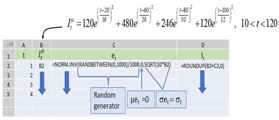 The values of can be easily generated in a spreadsheet. The values of , which arises from a random process, require the application of a simulation process, which can also be implemented in a spreadsheet (Figure 2):