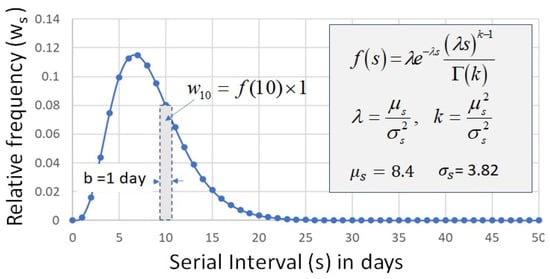 As we will be using the serial interval in our proposal, we will briefly review this concept. The values based on the serial interval are obtained in epidemiological studies for the current epidemic and are independent of the calendar time [12]. The values of are usually modeled with a distribution chosen by the analyst based on the most accepted information. Typically, it is modeled with Gamma (Figure 4), Lognormal, or Weibull distributions [20], facilitating its parametric generation by defining the parameters of the mean and the standard deviation .