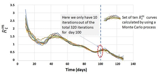 Since the denominator (10) behaves as a weighted average (low variability), the variability of is mainly caused by the variability of . Therefore, as is a kind of reproduction number, we will name it the noisy reproduction number (just a name to distinguish it from other reproduction numbers). To stabilize for useful purposes, we propose to obtain the mean by the standard Frequentist method: