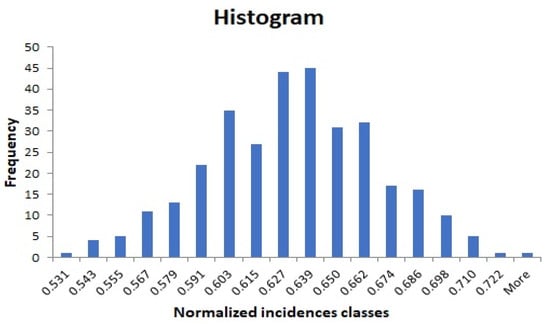 Histogram of the values of 320 random versions of , at time t = 100, following a Monte Carlo simulation process based on the series data generated with the random incidence series generator.