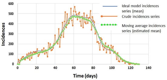 Now we will proceed to calculate the probability density function of the estimator (19). To begin with, it is noted that the numerator and denominator (19) are constructed with moving averages of the incidence series (Appendix A), which is a procedure that involves the overlap of “crude” incidence in the calculations of the means and of . Therefore, it cannot be said that the numerator and the denominator are independent. The same occurs between the means of the denominator (from now on denoted as ). As this lack of independence makes the analytical calculation of a formula for the probability density function of impossible, the problem was approached by applying the experimental method of Monte Carlo simulations, for which we worked with the generator of a series of incidence (Figure 2).